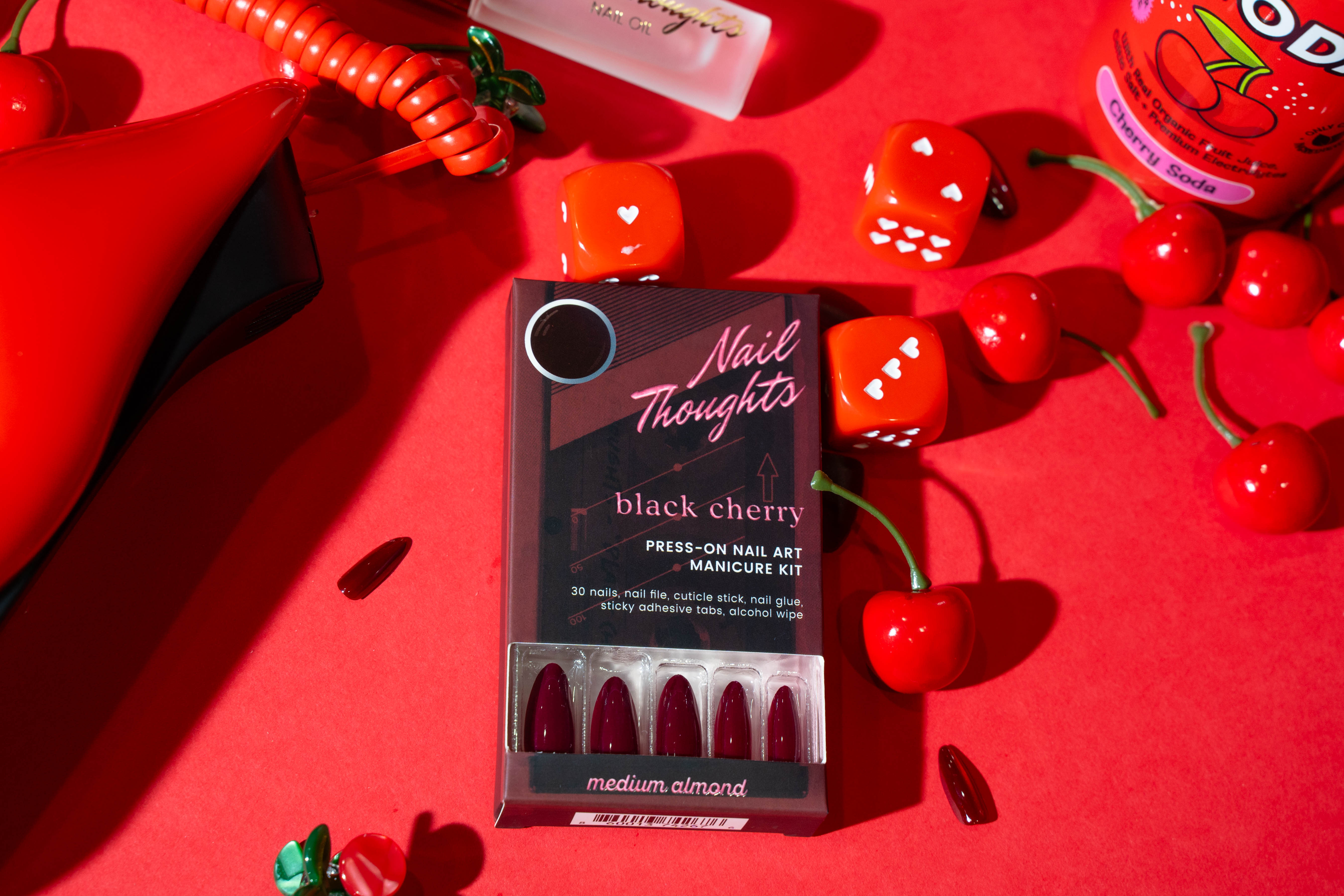 The Nail Thoughts Black Cherry Press on Nails kit is your classic deep ruby red nail color. It can be romantic, festive, or just an every day nail color. This specific color is always popular in the salon, so if you can't get in to your nail artist, let these have your back!