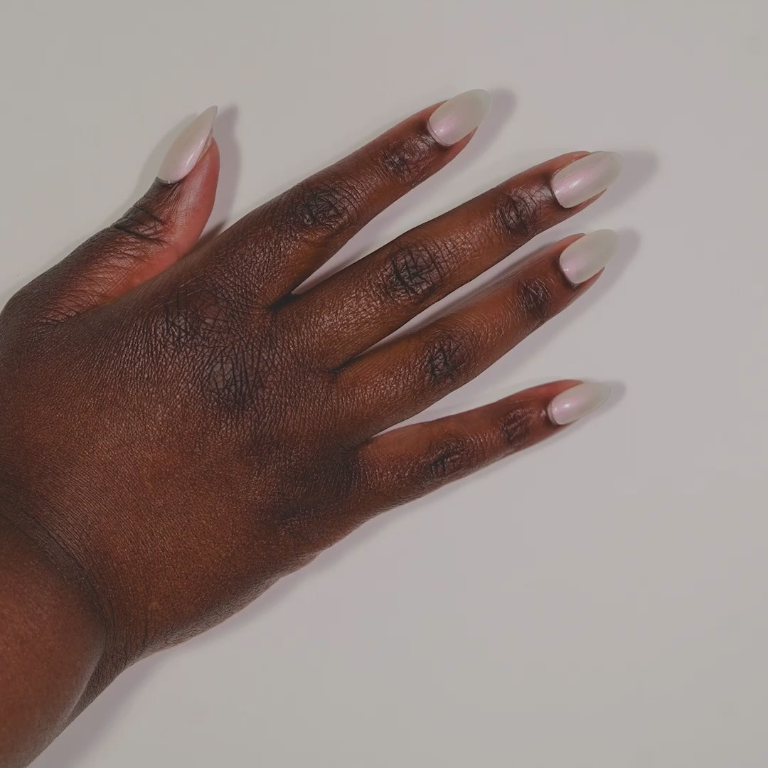 Frosted is a pearlescent and glowy milky white color. Picture a milky white color that has almost a chrome orange-y glow finish to it and you have FROSTED! This color finish is reminiscent of the glazed donut nail trend, but WITHOUT ALL OF THE WORK! Layer one thin coat of it over any color of your choice and boom, an instant frosty pearlescent glow. Wear it as a solid or layered and you have an amazing fake out chrome nail look.